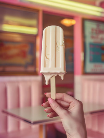 A single vanilla popsicle gently melting, held up against a colorful vintage diner backdrop.