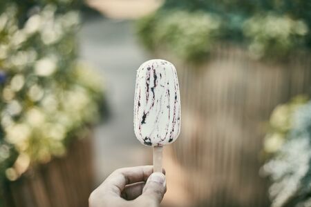 Young woman hand holding ice cream with white chocolate glaze, outdoors