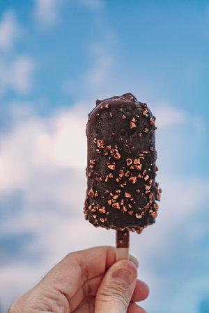 Hand of woman holding a chocolate ice cream on nature background