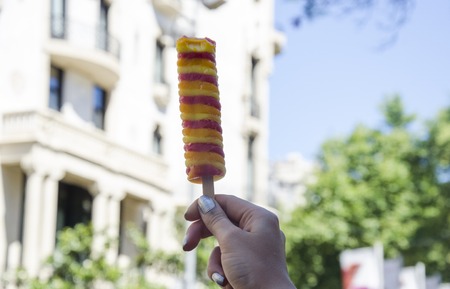 closeup the orange color and flavor stick ice cream hold hand over out of focus brown background.