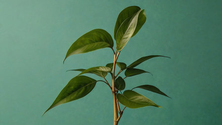 Close Up of Smooth, Waxy Leaf Texture on Vibrant Teal Background With Minimalist Design.