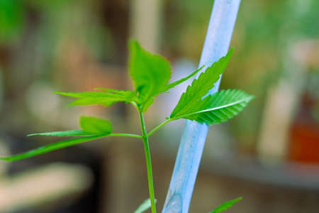Marijuana plant seedling growing from seed on a bright summer day. Close up.