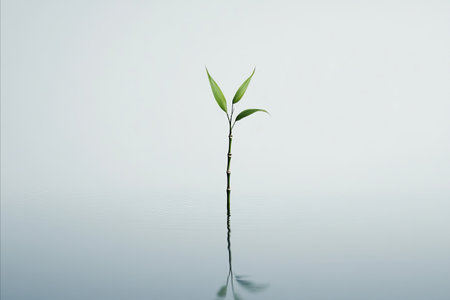 A delicate green sprout stands tall and slender, reflecting on a subtle surface, embodying themes of new life, hope, and environmental purity.
