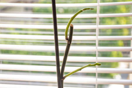 Phalaenopsis orchid flower steam with a new young steam at home. Botanical and house flowers concept. Close up, blurred motion and selective focus