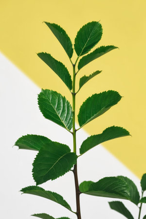 AI Generated. Green Leaves Branch on Yellow Background