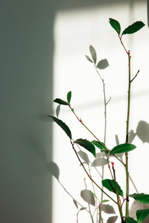 A vibrant green branch with leaves contrasts beautifully against a textured white wall, creating striking shadows. This image captures the essence of simplicity in nature.