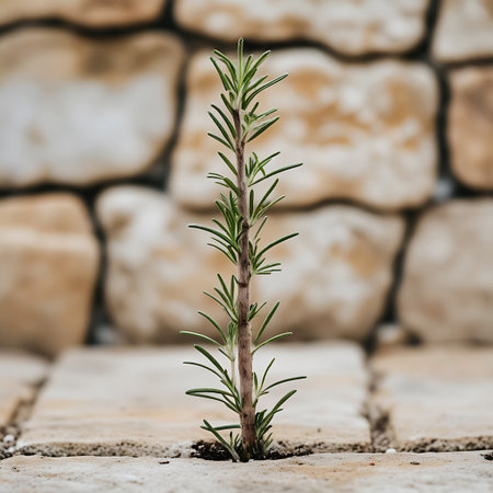 A small, green rosemary plant with delicate leaves is growing defiantly through the cracks in a stone paved surface, symbolizing resilience.