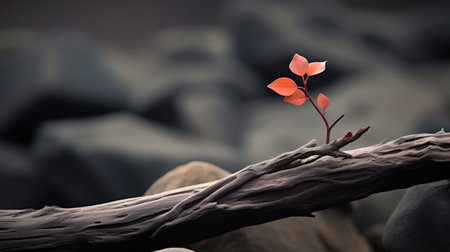 A small red flower sitting on a branch of wood, AI