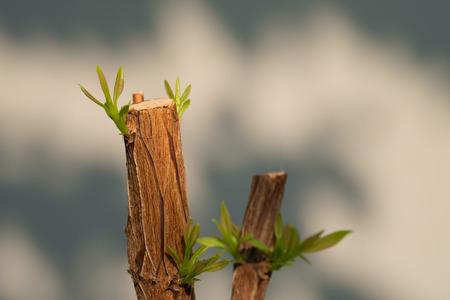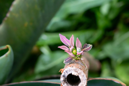 Old twig of a plant with a very small new sprout. Vivid greenery in the blurry background. Botanical garden, Canico, Madeira, Portugal.
