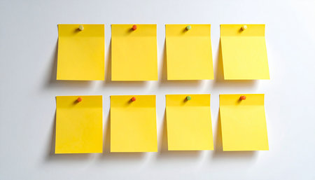 Eight blank yellow sticky notes are pinned with colorful pushpins in two rows on a white surface, ready for messages.