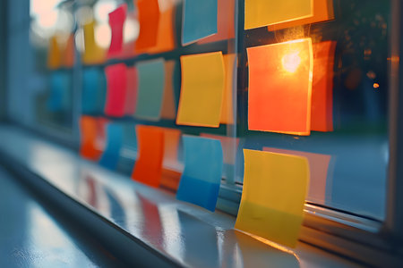 Sticky notes on glass window illuminated by sunlight create warm and inviting atmosphere. golden light enhances colors, adding sense of creativity and organization to scene