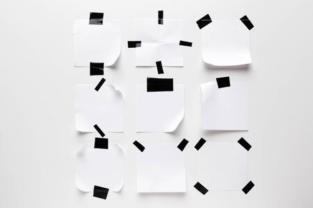 White ripped note, notebook paper stuck with black sticky tape isolated on white background. Creative Photo
