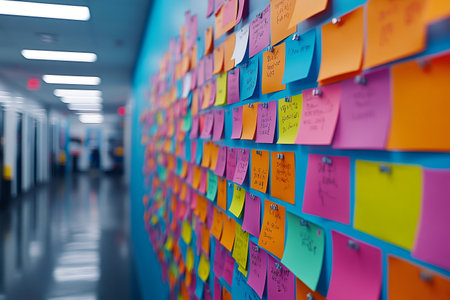 Sticky notes board in office. Many different colorful paper stickers pinned on wall. Memory notes for business planning. Created with Generative AI