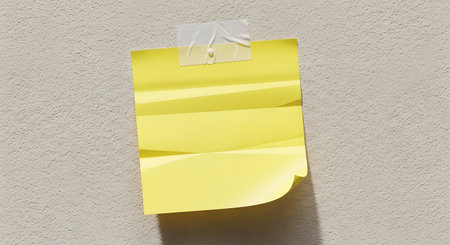 A yellow sticky note is attached to a white wall, partially peeled off, showing a blank surface ready for notes or reminders.