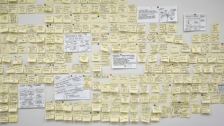 A white wall is densely covered with numerous yellow post-it notes and a few white papers, all filled with handwritten text and diagrams, creating a visually complex and information-dense display.