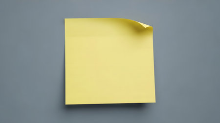 A yellow sticky note is placed on a gray background, with one corner curled up, giving it a slightly used appearance. The note is blank, ready for writing or drawing.