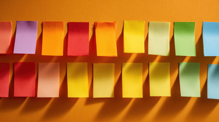 Colorful Sticky Notes in a Row on an Orange Background Ideal for Creative Planning, Organization, and Project Management Concepts in Modern Workspace