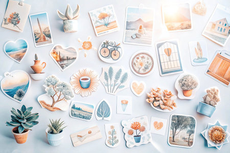 Creative paper cutouts, nature photos, light pastel color aesthetic, flat lay design