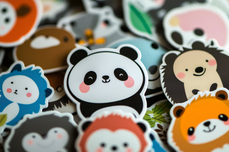 Colorful stickers with cute kawaii animal designs, including smiling pandas, hedgehogs, and other adorable creatures