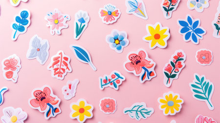 Various stickers featuring bright colors and fun phrases lie scattered across a bold pink surface, creating a lively and cheerful display.