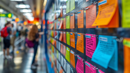 Colorful Post-it Notes Covering a Bulletin Board in a Busy Public Space