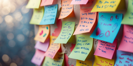 Colorful sticky notes filled with reminders and thoughts on a wall in a creative workspace during daytime