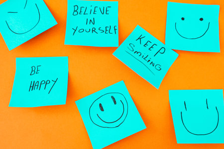 Smiley face sticky note on a bathroom mirror, with motivational messages surrounding it. Bright and uplifting scene