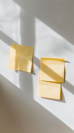 Two yellow sticky notes adhered to a textured wall, casting subtle shadows. Focus on the paper and wall texture.