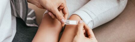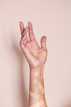 Close up photo of attractive young woman in underwear glues antibacterial plaster on her finger against beige background.
