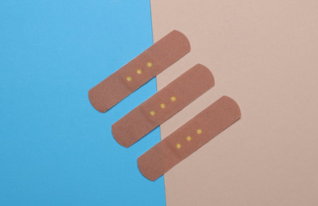 skin color medicine adhesive healing bandage layout on blue background. medical aid patch concept