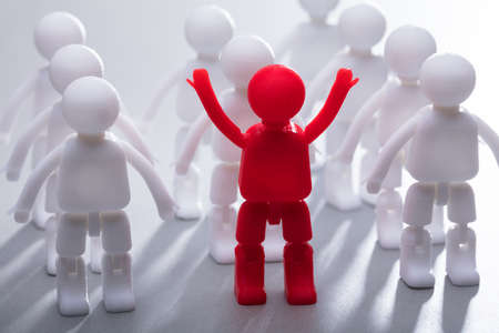 Close-up Of A Red Human Figure With Arm Raised Standing With Team In A Row