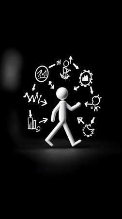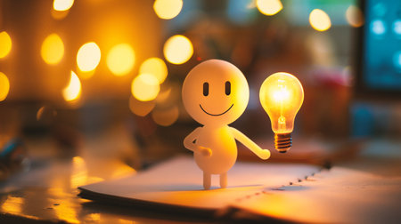 A simple white figurine with a smiling face and black limbs walks with a raised arm. White hand-drawn lines radiate from its head, symbolizing a bright idea or inspiration.