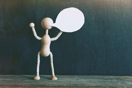 A blank white sheet in the hand of a wooden figure of a person on a blue background, a place under the text or image.