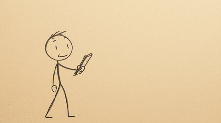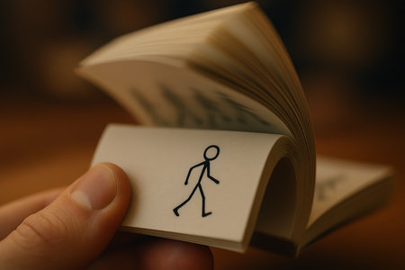 A close-up shot of a hand rapidly flipping the pages of a small book, creating a classic flipbook animation of a hand-drawn stick figure walking. This engaging visual represents traditional animation, creativity, motion, and the simple magic of bringing drawings to life. The blurred background highlights the dynamic action and the focus on the animated sequence.