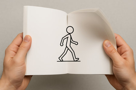 A person's hands are shown holding an open book with crisp, blank white pages. On the right page, a simple, minimalist line art stick figure is depicted walking, symbolizing concepts of progress, a new journey, personal development, or turning over a new leaf. The image offers ample copy space for text or additional design elements.