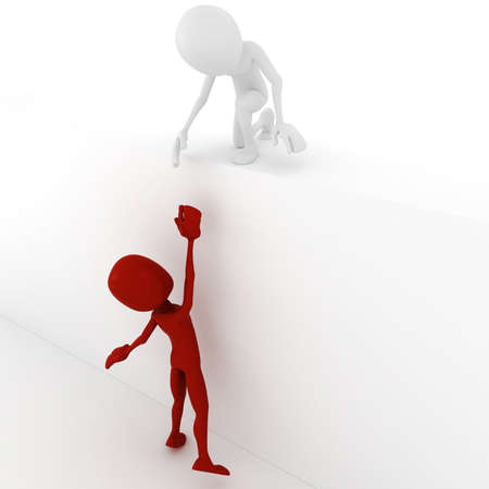 Wide view image of male hand drawing a line between two wooden pegs for a silhouette of a man to walk across. Over yellow background with copy space.