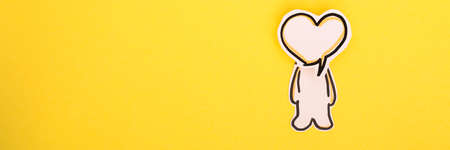 Wooden doll with gesture on yellow background. Mannequin shows gesture. Figure of wooden human with copy space
