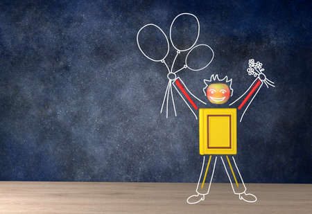 Illustration of a joyful character from school supplies, who holds flowers and balloons