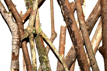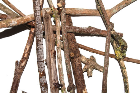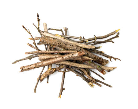 Small natural fallen tree twigs sticks and branches on a white background