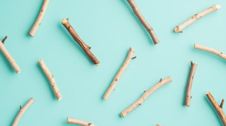 A collection of natural wooden sticks arranged randomly on a vibrant turquoise background, perfect for showcasing nature's beauty and creativity in designs.