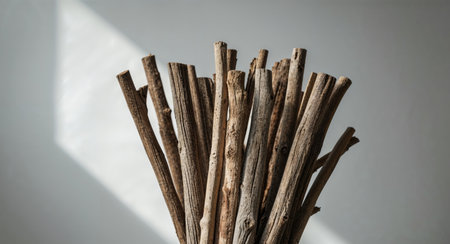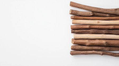 Natural wooden sticks arranged aesthetically on a light background, showcasing various shades of brown, perfect for organic design themes and rustic decor