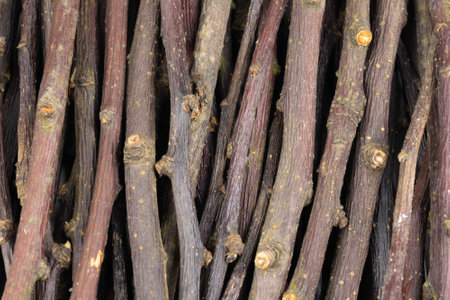 Exactly trimmed cuttings of branches without bark. Composition of wood.