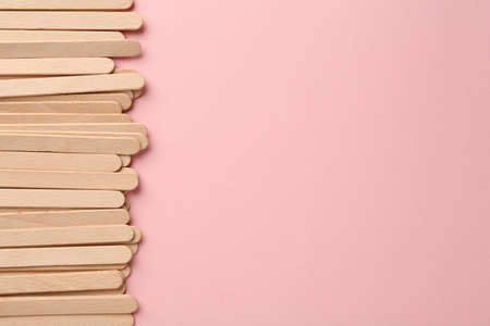 Wooden waxing spatulas on light pink background, flat lay. Space for text