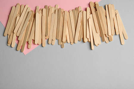 top view of depilation wooden sticks on pink background, panoramic shot