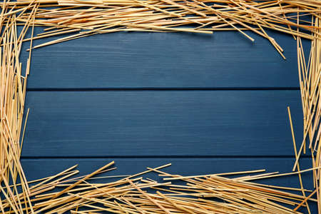 Frame of dried hay on blue wooden background, flat lay. Space for text