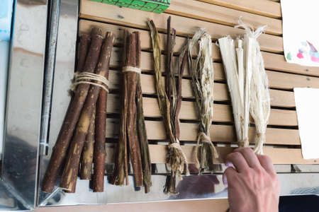 Powder and licorice root on the table - Glycyrrhiza glabra.