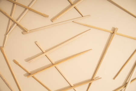 Many Chinese sticks lie on a light sandy background. Top view, flat lay.