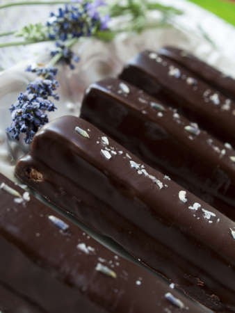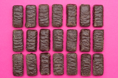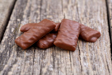 Brown chocolate sticks in full frame. Sweet candies with drops of water on the shop window.