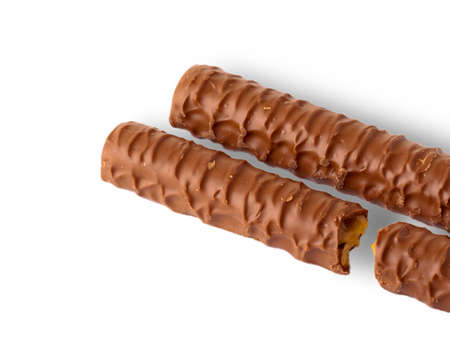 Closeup of chocolate bar with Caramel and Biscuit isolated on white.
