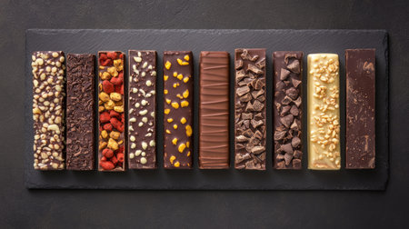 An exquisite selection of chocolate bars displayed on a slate background showcases various textures and flavors, perfect for dessert lovers and gourmet enthusiasts.